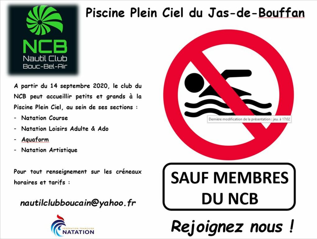 Pour cette nouvelle saison sportive et en raison de la fermeture de la piscine de Bouc Bel Air, toutes les activités du NCB sont délocalisées sur la piscine Plein ciel , Avenue Marcel Pagnol, quartier Jas de Bouffan à Aix en Provence.